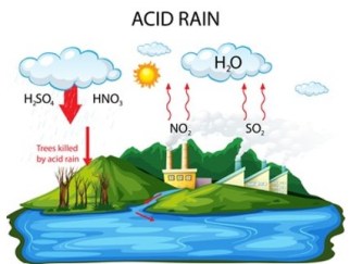 Acid rain results when sulphur dioxide(SO2) and nitrogen oxides (NOX) already present in the atmosphere react with water, oxygen and other chemicals to make sulphuric and nitric acids.