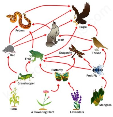 This interaction happens because a single organism can be eaten by many others and similarly a single organism can eat many organisms. For e.g. A grasshopper can be eaten by both rat and frog and in addition frog also eats a butterfly. So this forms a whole network known as food web.