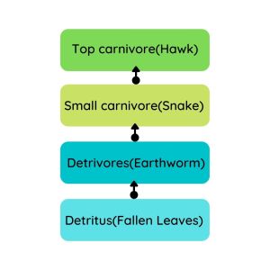 1)DETRITUSFOODCHAIN– This type of food chain begins with dead organic material. The food energy passes into decomposers and detritivores (fungi, bacteria, protozoans), which are further eaten by smaller organisms like carnivores.