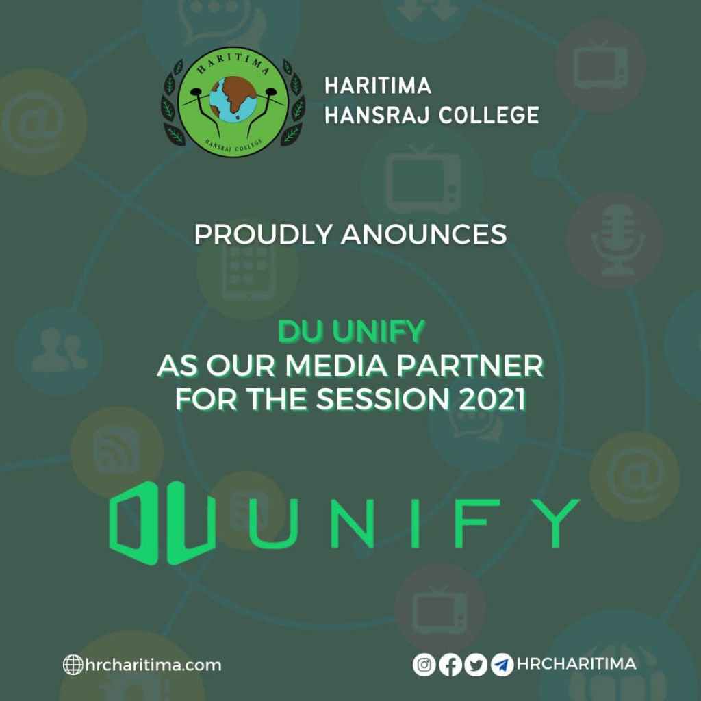 We are elated to announce DU Unify as our media partner for the 2021-22 session. DU Unify is the one stop destination to get updates about all the upcoming events across the DU circuit. It acts as an effective platform in bringing together opportunities at the door step of all those waiting for one and gives ample amount of promotions hypes to the society events needed to guarantee success.✨